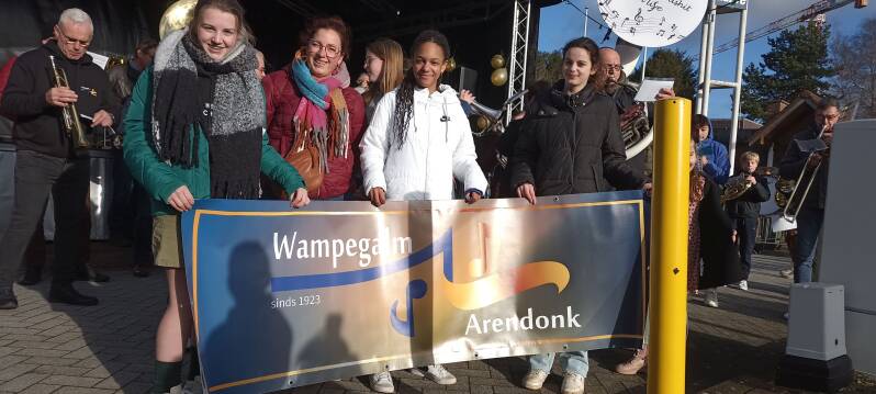 Als laatste verschenen enkele jonge ‘wampegalmers’ die met hun spandoek duidelijk maakten wat de bedoeling was van dit onverwachte muzikale intermezzo. Fanfare Wampegalm bestaat in 2023 100 jaar!