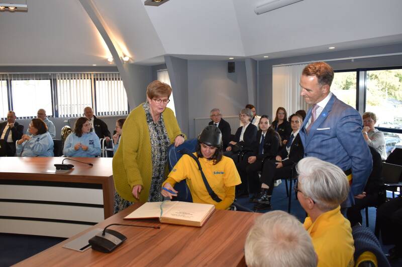 Daarna volgde er nog een klein muzikaal intermezzo en kreeg onze voorzitster een bloemetje van de burgemeester. Dan met z'n allen op weg naar een aanpalende zaal maar vooraleer daar 'binnen te treden' mocht iedereen zijn/haar naam noteren in het 'gulden boek'.