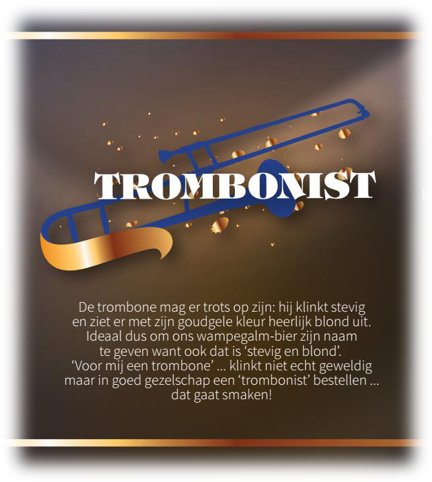 Ideaal dus om ons wampegalm-bier zijn naam te geven want ook dat is ‘stevig en blond’. ‘Voor mij een trombone’ ... klinkt niet echt geweldig maar in goed gezelschap een ‘trombonist’ bestellen ... dat gaat smaken!
